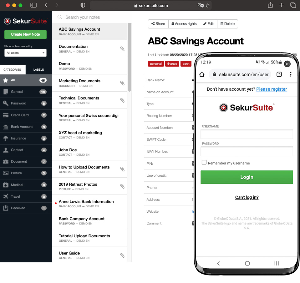 Securely Manage and Create Encrypted Passwords, Store and Share Notes and Documents of all types, with the protection of Swiss Privacy Laws using Military Grade Encryption. Your data is fully encrypted in SekurSuite and scanned for viruses as you back it up.
